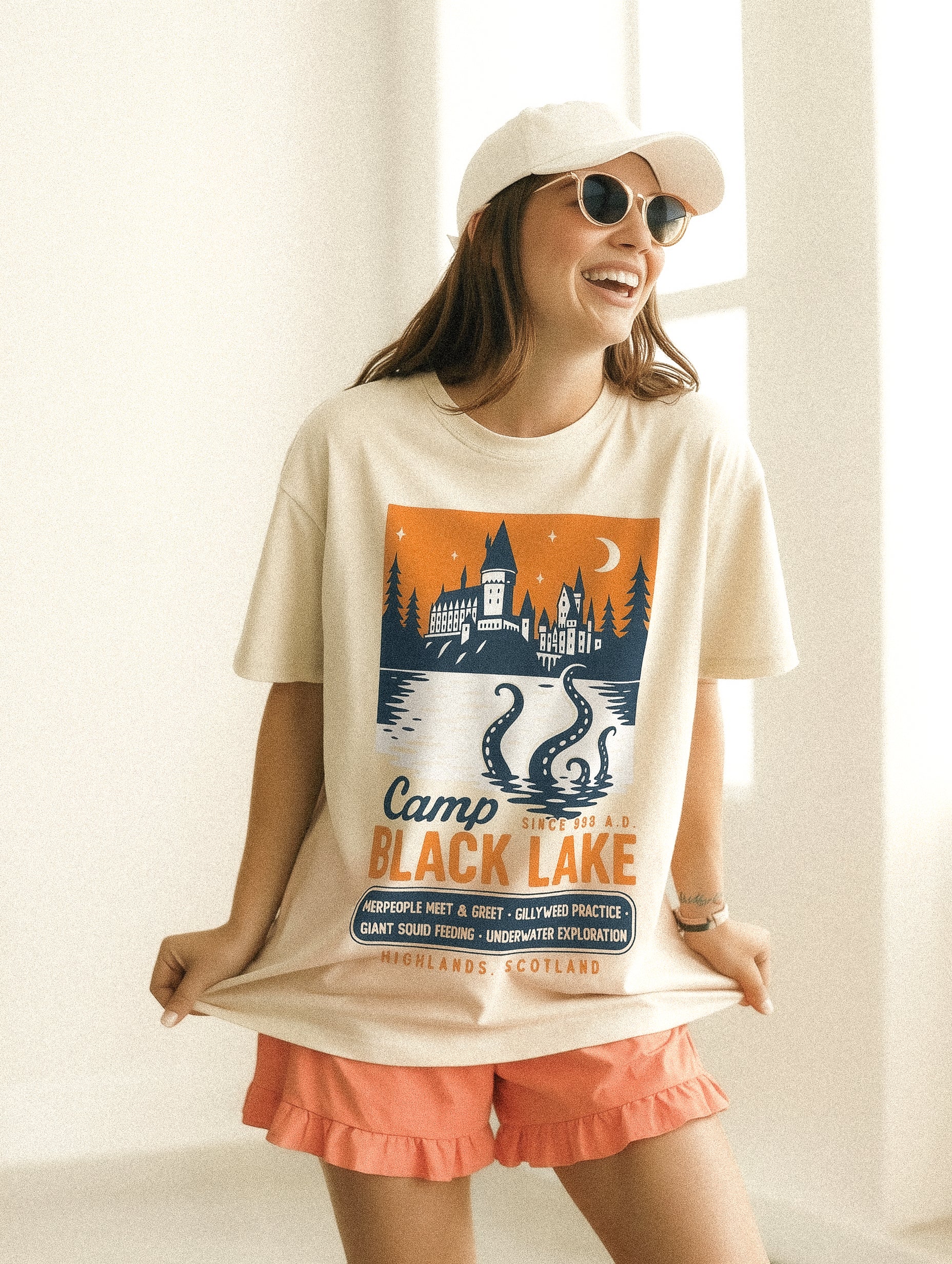 This vintage camp tee is your official badge of honor from the Hogwarts waterfront. Featuring hand-drawn castle views, moonlit waters, and that slightly ominous squid sighting, it’s perfect for magical campers, herbology kids, and underwater explorers alike.